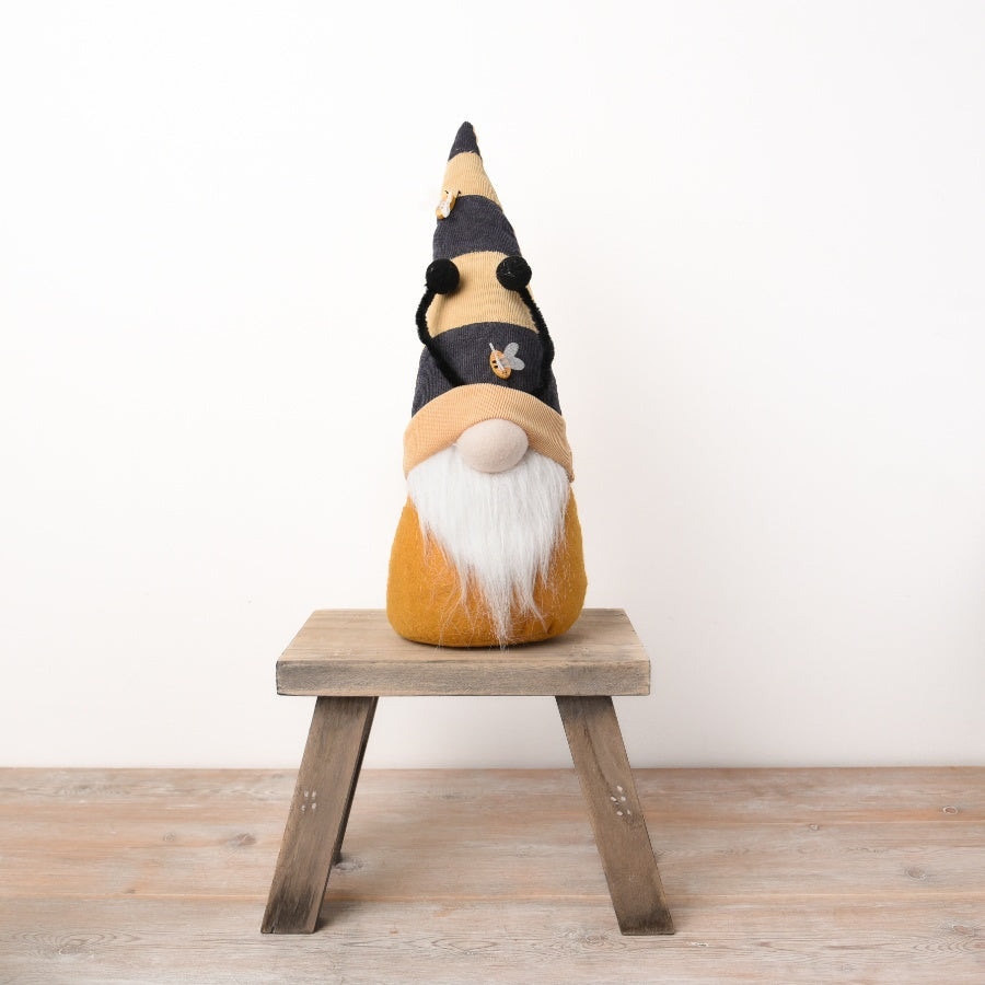 Bring some buzz-worthy charm into your home with this adorable bee-themed gonk. Crafted from soft ribbed fabric in warm ochre and black, this unique decoration is full of character and detail. Its tall striped hat is adorned with miniature bees, while bendy antennae add a playful touch.
