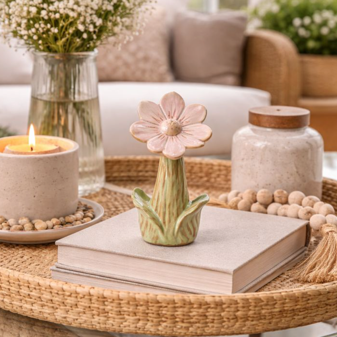 Add a delicate touch of charm to your home with this glazed standing flower ornament, finished in a soft ditsy pink tone with a beautifully contrasting warm green stem. Subtle glazing highlights the gentle curves and floral detailing, giving the piece a handcrafted, timeless feel.