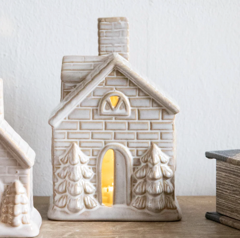 Add a warm, welcoming glow to your home with this beautifully crafted Reactive Glaze LED House Ornament. Finished in a soft ivory tone with a subtle glossy glaze, each piece showcases delicate brick and window detailing, along with charming fir trees framing the front door.