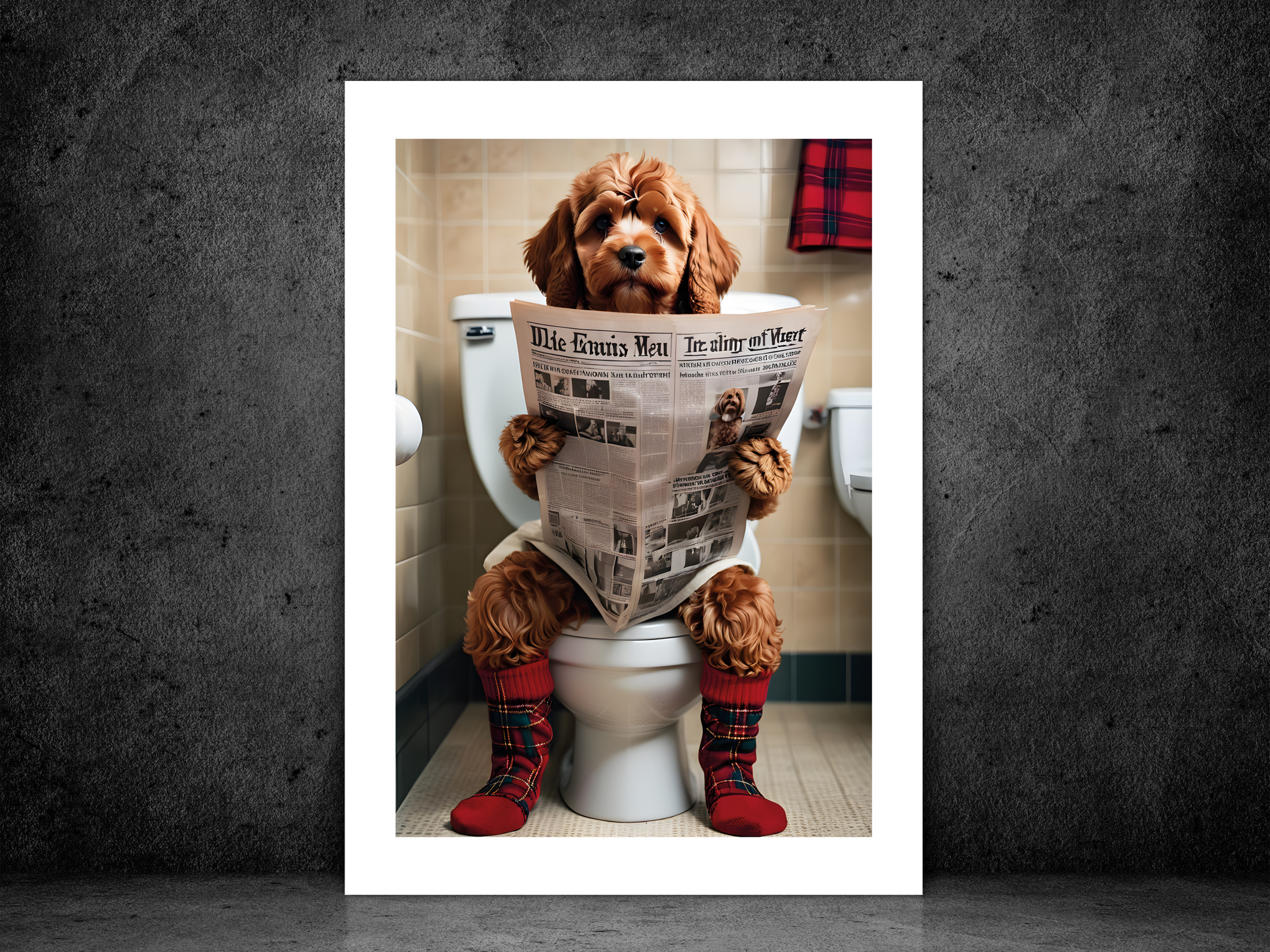 Red Cockapoo on Toilet